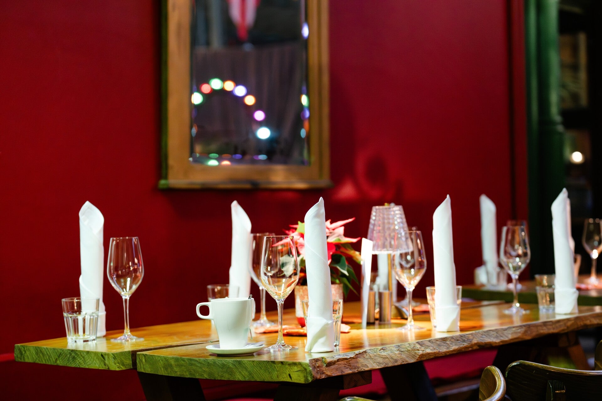 Das Interieur kombiniert natürliche Materialien wie Holz mit dekorativen Elementen wie Pflanzen und Kerzen. Dadurch entsteht eine warme und einladende Umgebung, die sowohl für ein entspanntes Mittagessen als auch für ein geselliges Abendessen geeignet ist. Die offene Einbindung in die Markthalle verstärkt das Gefühl von Lebendigkeit und Urbanität, während gleichzeitig ein gewisser Rückzugsort geboten wird.