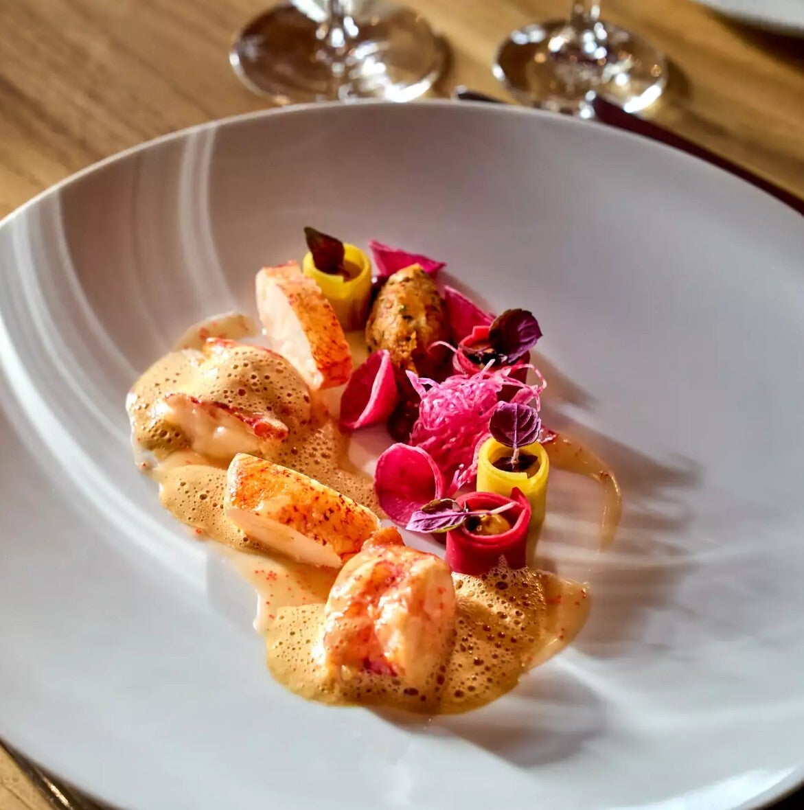 Der Hummer ist dabei unbestrittener Star der Küche. Ob als ganzer bretonischer Hummer klassisch mit zerlassener Butter serviert, fein ausgelöst mit aromatischen Kräutern veredelt oder als luxuriöse Komposition im Surf and Turf – stets steht das Produkt im Mittelpunkt. Die Zubereitung ist präzise, respektvoll und auf den Punkt gegart, sodass das zarte Fleisch seine saftige Struktur behält. Jeder Bissen offenbart die Qualität der Ware und das handwerkliche Können der Küche. Der Hummer ist hier nicht Beilage oder Akzent, sondern Protagonist eines kulinarischen Gesamterlebnisses.